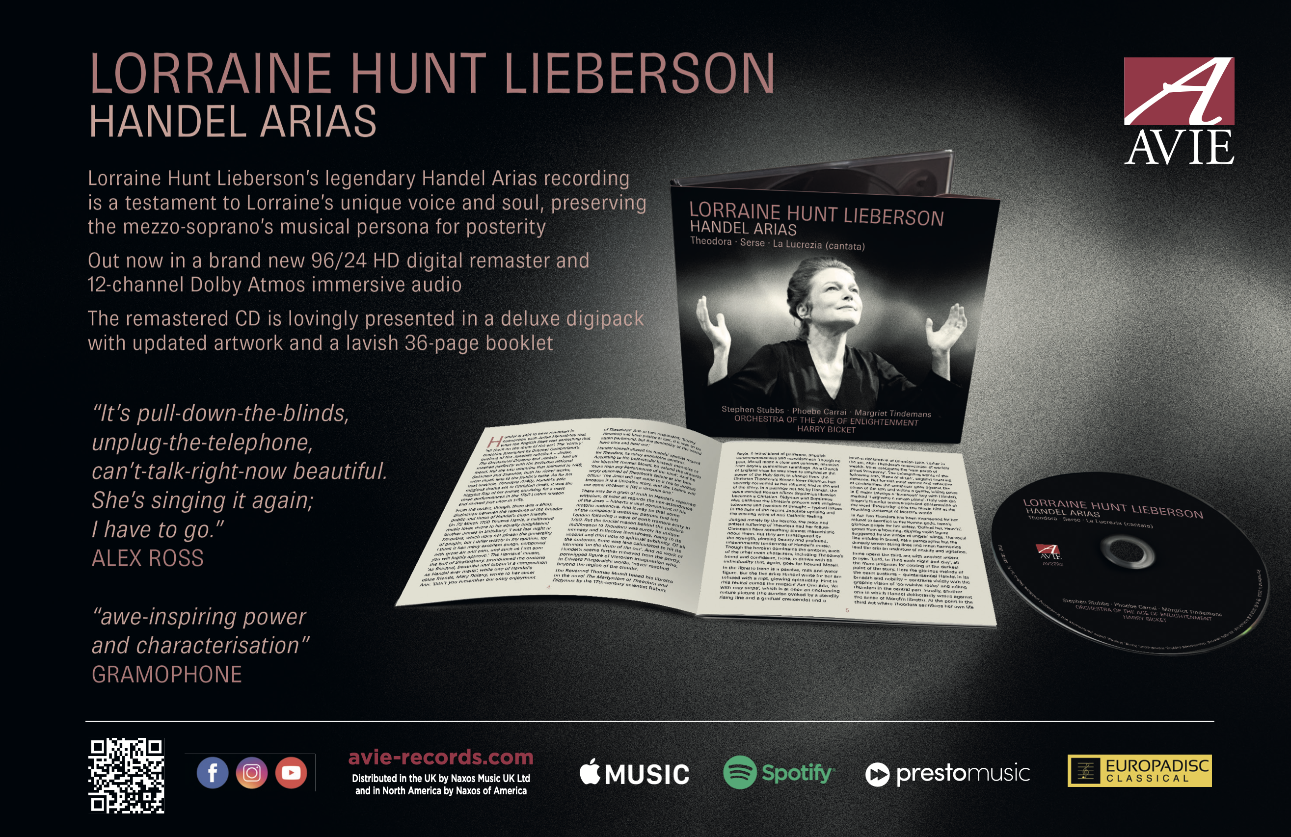 This legendary programme by Lorraine Hunt Lieberson from 2003 has been given a sparkling new 2025 makeover: not least a brand new 96/24 HD digital remaster along with a 12-channel Dolby Atmos immersive audio release, the remastered CD product has been lovingly presented in a deluxe digipack with updated artwork and a lavish 36-page booklet.